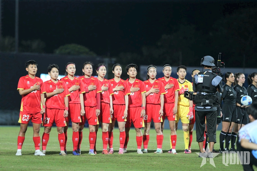 | Các cầu thủ nữ Việt Nam trong lễ chào cờ trước trận. Ảnh: VIỆT AN |