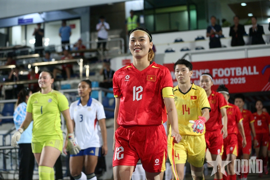 | Đội tuyển nữ Việt Nam và tuyển nữ Philippines bước ra sân đá trận chung kết tranh huy chương vàng SEA Games 33. Ảnh: VIỆT AN |