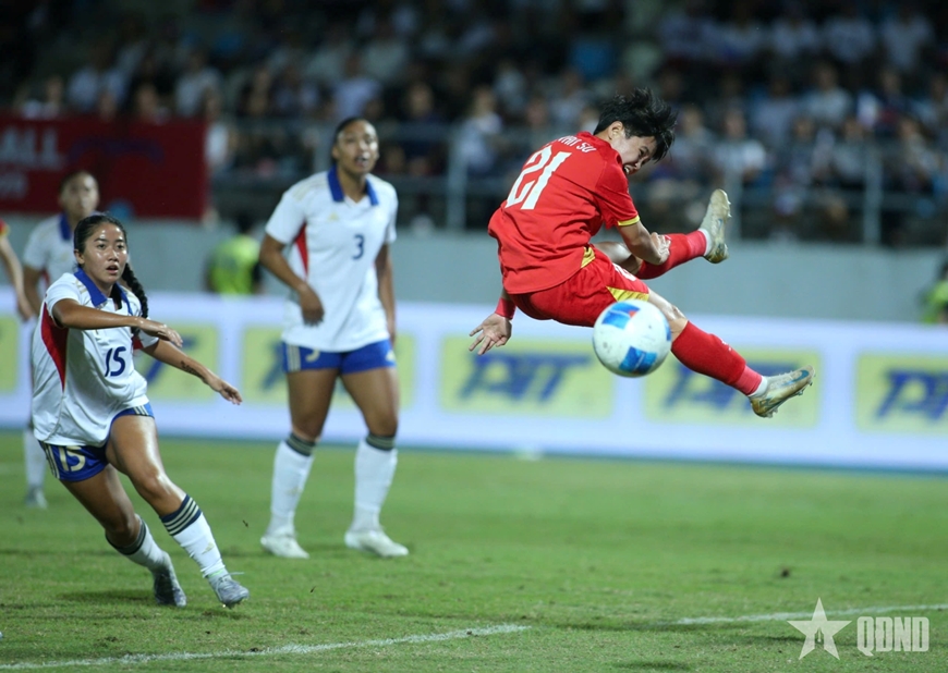 | Bích Thùy đứng trên một hậu vệ cuối cùng của Philippines một khoảng khá xa, trước khi đánh đầu tung lưới đối phương. |
