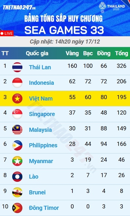 Bảng tổng sắp huy chương SEA Games 33 tính đến 14 giờ 20 phút ngày 17-12. Ảnh: Thethao247