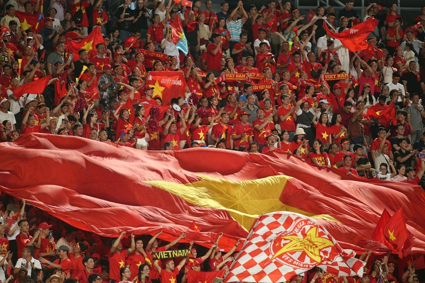 | Cờ đỏ sao vàng đỏ rực góc khán đài sân Rajamangala, Thái Lan. Ảnh: VIỆT AN |