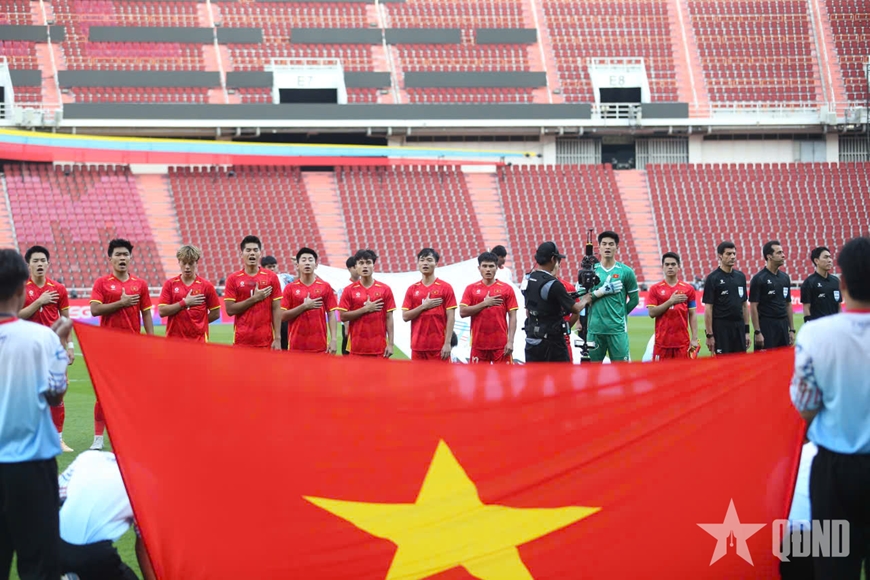 | Các tuyển thủ U22 Việt Nam thực hiện nghi thức chào cờ trước trận đấu. |