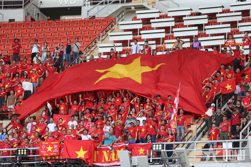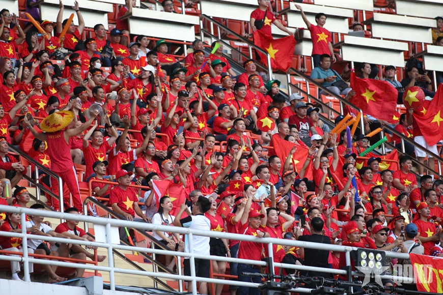 | Cổ động viên Việt Nam trên khán đài vỡ òa cảm xúc. |