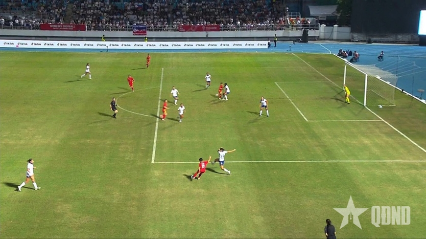 Phút 29, từ pha lên bóng bên cánh phải, Vạn Sự tạt chuẩn xác để Bích Thùy đánh đầu tung lưới Philippines. Cả sân Chonburi như nổ tung trong khoảnh khắc ăn mừng của các cầu thủ Việt Nam. Nhưng niềm vui ấy nhanh chóng bị dập tắt khi trọng tài biên căng cờ báo việt vị và trọng tài chính Rebecca Durcau (Australia) lập tức công nhận quyết định mà không cần tham khảo thêm.