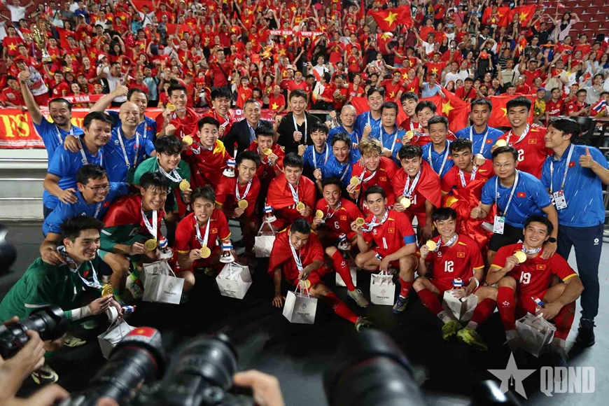 | Các thành viên U22 Việt Nam mừng tấm huy chương vàng môn bóng đá nam SEA Games 33. Ảnh: VIỆT AN |