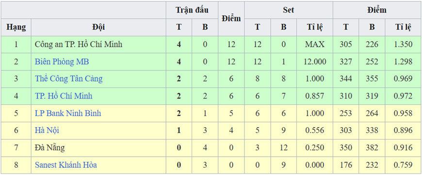 | Bảng xếp hạng bảng nam sau trận thắng của Biên phòng MB. |