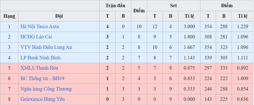 | Bảng xếp hạng bảng nữ sau chiến thắng của Hóa chất Đức Giang Lào Cai. |