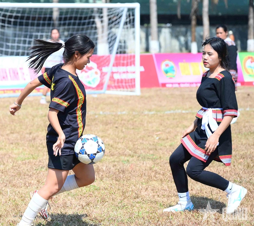 Pha tranh bóng đẹp mắt giữa cầu thủ đội bóng đá nữ Đoàn Kinh tế - Quốc phòng 732 - SaLoong (Binh đoàn 15) gặp đội JRai (tỉnh Gia Lai).