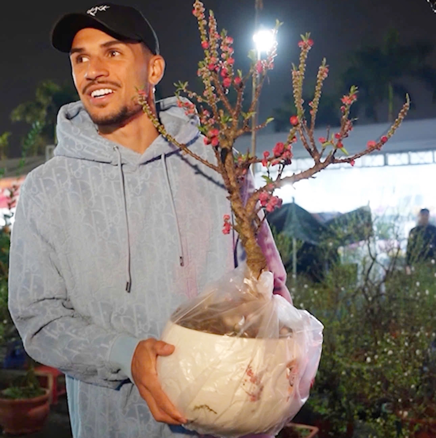 Cái Tết đầu tiên trên tư cách công dân Việt Nam của cầu thủ nhập tịch Đỗ Hoàng Hên (Hendrio Araujo) thật đặc biệt. Sau buổi tập cùng Hà Nội FC, anh dành thời gian đi tìm hiểu về bánh chưng, món ăn truyền thống của người Việt và tự tay chọn một cây đào nhỏ.