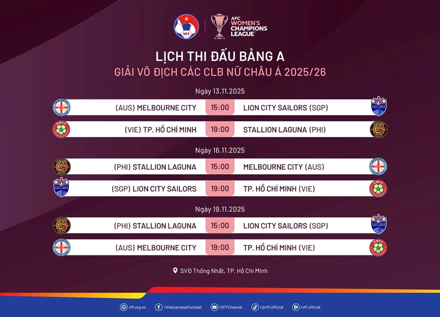 Theo lịch thi đấu bảng A, CLB nữ TP Hồ Chí Minh sẽ lần lượt gặp Stallion Laguna (Philippines) ngày 13-11, Lion City Sailors (Singapore) ngày 16-11 và Melbourne City (Australia) ngày 19-11. Tất cả các trận đều diễn ra trên sân vận động Thống Nhất, TP Hồ Chí Minh.