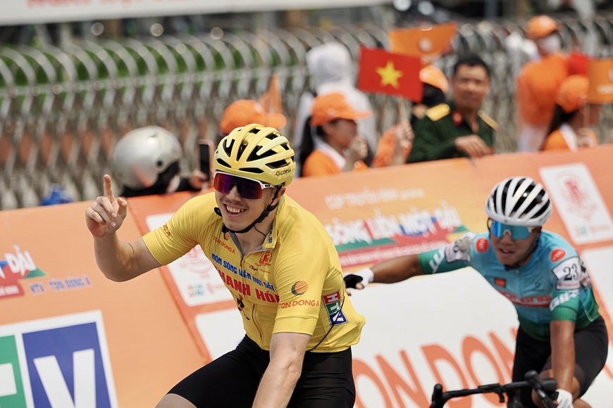 | Khoảnh khắc Marchuk Dzianis cán đích chặng 5, tiếp tục giữ Áo vàng và Áo cam. Ảnh: QUANG LIÊM |
