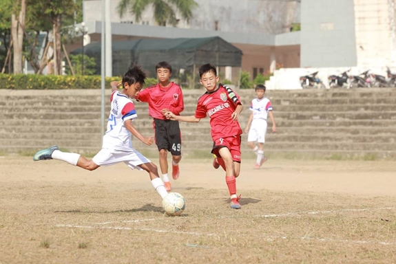 Cầu thủ trẻ ở Trung tâm Bóng đá Ngọc Hùng (ngoài cùng, bên trái) thường xuyên được thi đấu giao hữu với các đội bóng trẻ khác. |