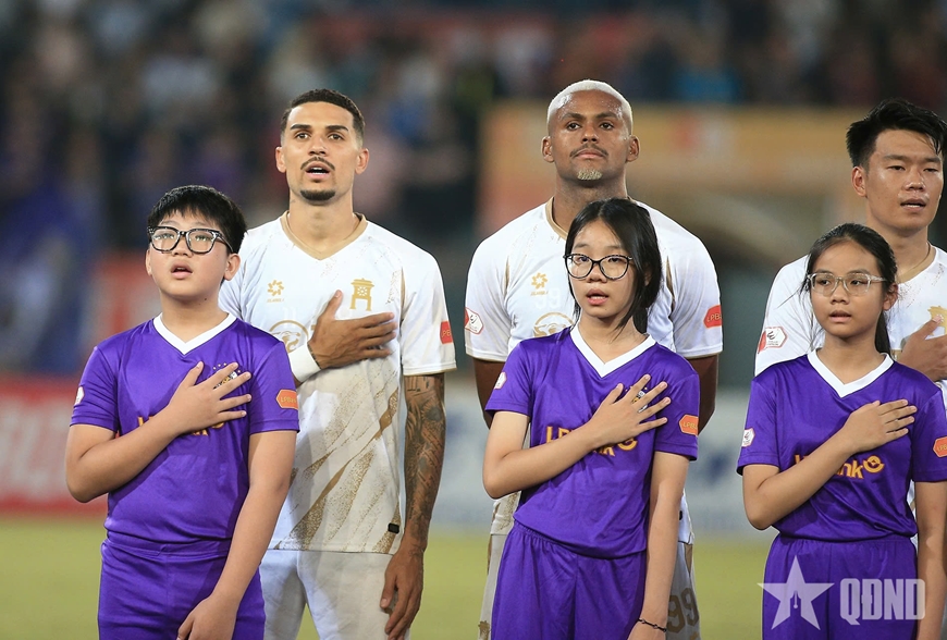 | Đỗ Hoàng Hên (áo trắng, bên trái) trong màu áo Hà Nội FC. |