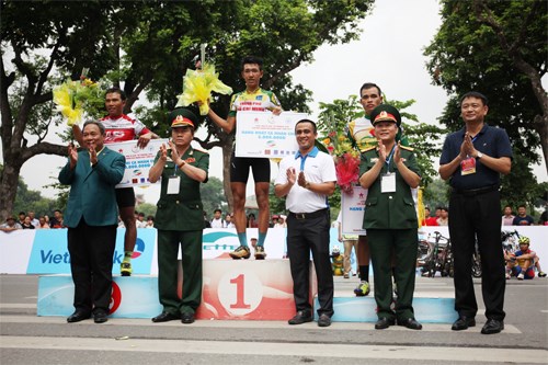 Ban tổ chức trao giải nhất, nhì, ba tặng các VĐV sau khi kết thúc cuộc đua tài hấp dẫn chặng 1. Ảnh: TÔ NGỌC ANH MINH