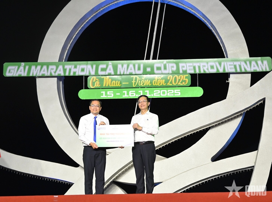 | Đồng chí Trần Quang Dũng trao bảng tượng trưng tài trợ thương hiệu Giải chạy Marathon Cà Mau giai đoạn 2026-2028. |