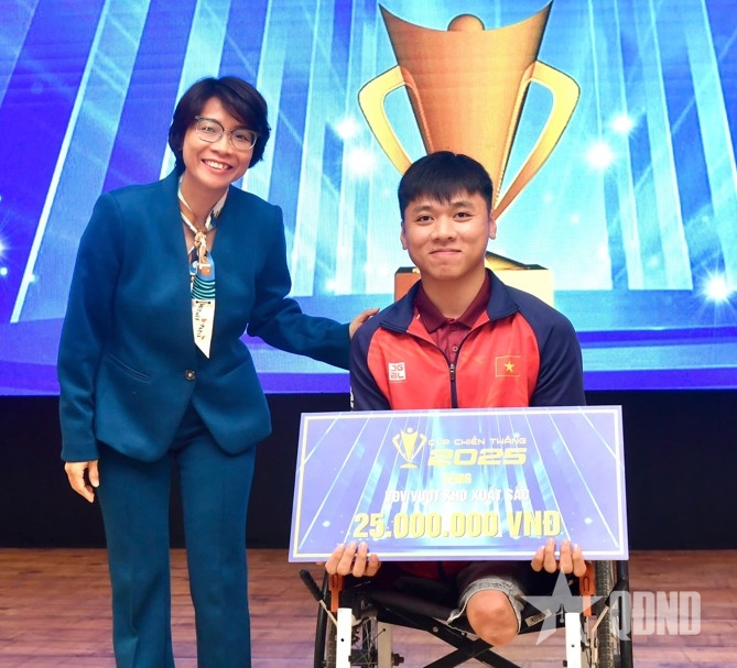 Ban tổ chức Cúp Chiến thắng 2025 tặng thưởng vận động viên khuyết tật Phạm Tuấn Hưng. Ảnh: VĂN DUY