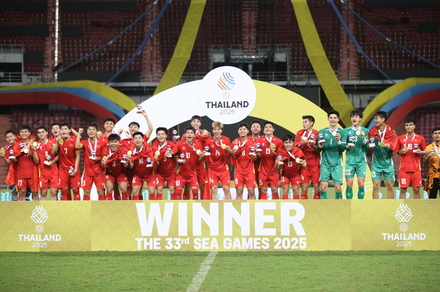 | Các cầu thủ U.22 Việt Nam rạng rỡ nhận huy chương vàng SEA Games 33. Ảnh: NGUYỄN QUYẾT |