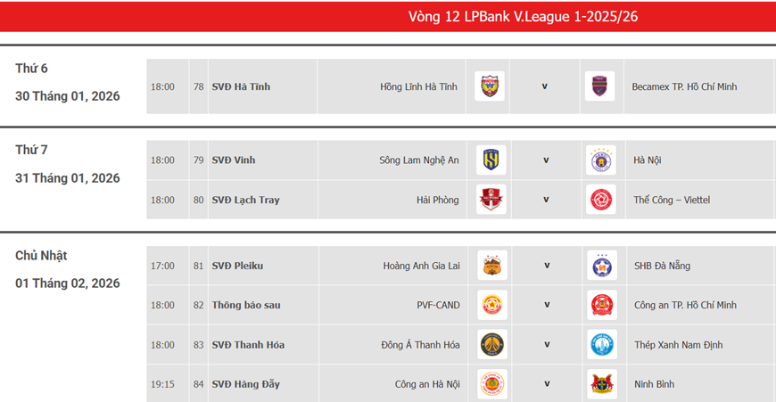 Vòng 12 V-League 2025-2026 còn có các cặp đấu hấp dẫn: Hồng Lĩnh Hà Tĩnh - Becamex TP Hồ Chí Minh, Hoàng Anh Gia Lai - SHB Đà Nẵng, Hải Phòng - Thể Công-Viettel...