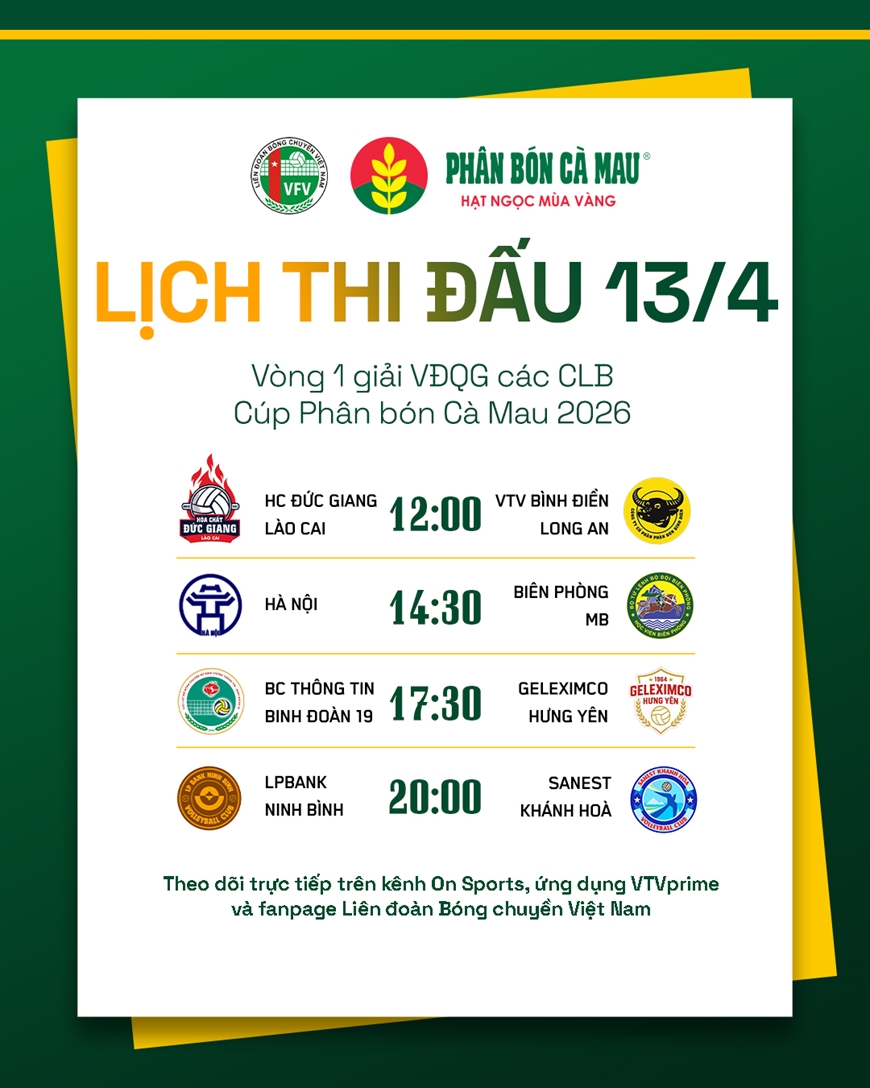 Cập nhật lịch thi đấu bóng chuyền hôm nay ngày 13-4, với tâm điểm là các trận đấu thuộc vòng 1 Giải bóng chuyền vô địch quốc gia các câu lạc bộ năm 2026.