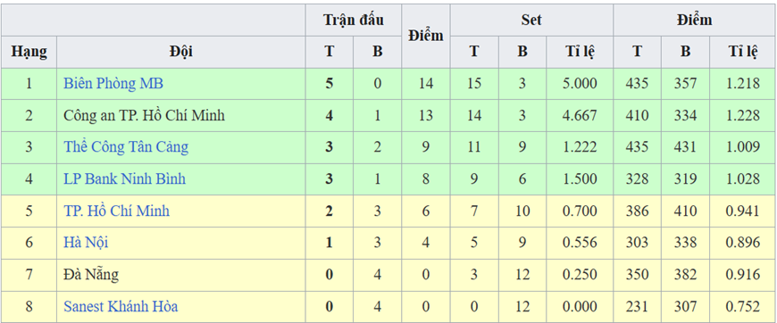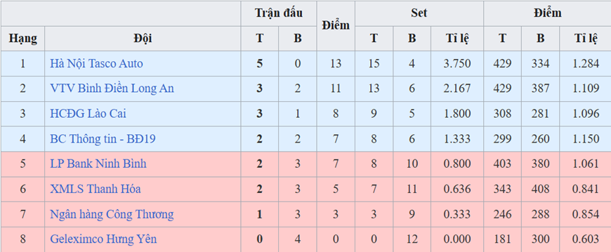 Trong khi đó, ở bảng nữ, tân binh Hà Nội Tasco Auto tiếp tục gây bất ngờ khi dẫn đầu sau 5 trận toàn thắng.