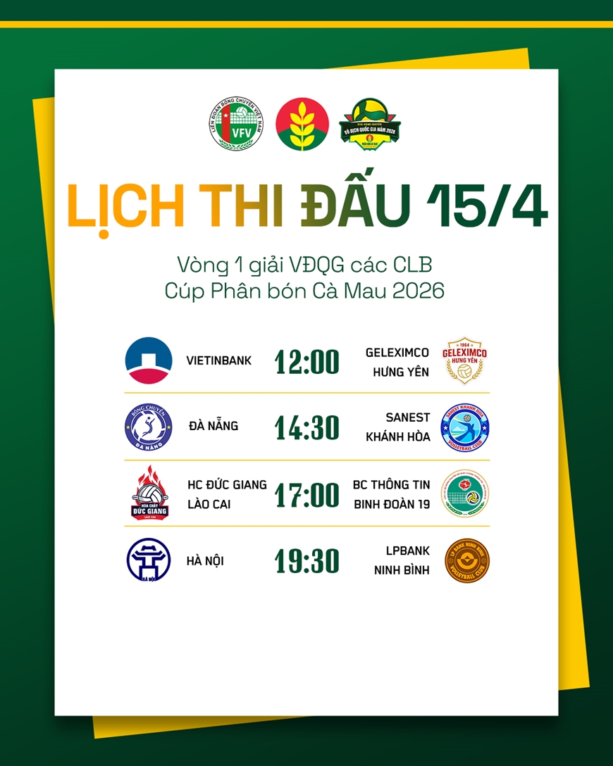 Cập nhật lịch thi đấu bóng chuyền hôm nay (15-4) với tâm điểm là các trận đấu tại vòng 1 Giải bóng chuyền vô địch quốc gia các câu lạc bộ năm 2026.
