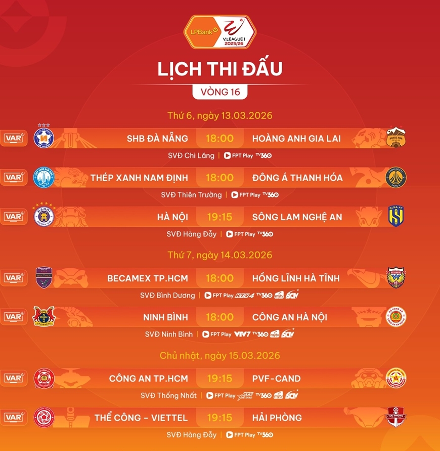 Lịch thi đấu vòng 16 V-League 2025-2026 còn có các cặp đấu: SHB Đà Nẵng-Hoàng Anh Gia Lai, Thép Xanh Nam Định-Đông Á Thanh Hóa, Hà Nội-Sông Lam Nghệ An...