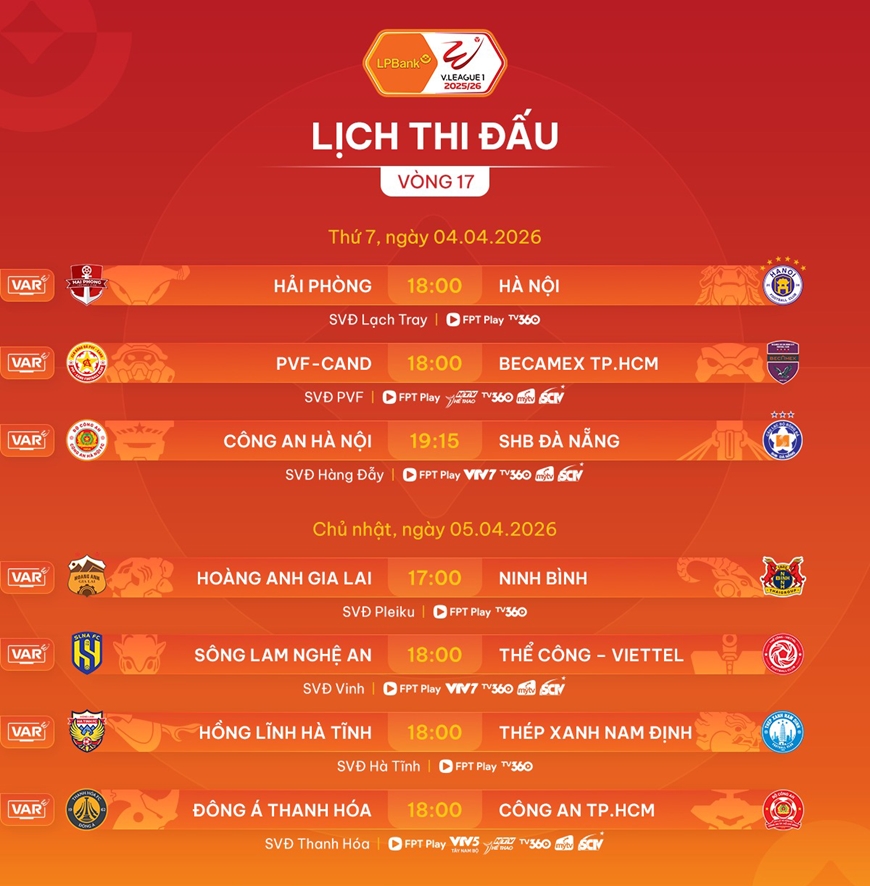 Vòng 17 V-League 2025-2026 còn có các cặp đấu hấp dẫn: Hoàng Anh Gia Lai - Ninh Bình FC, Hồng Lĩnh Hà Tĩnh - Thép Xanh Nam Định, Đông Á Thanh Hóa - Công an TP Hồ Chí Minh…