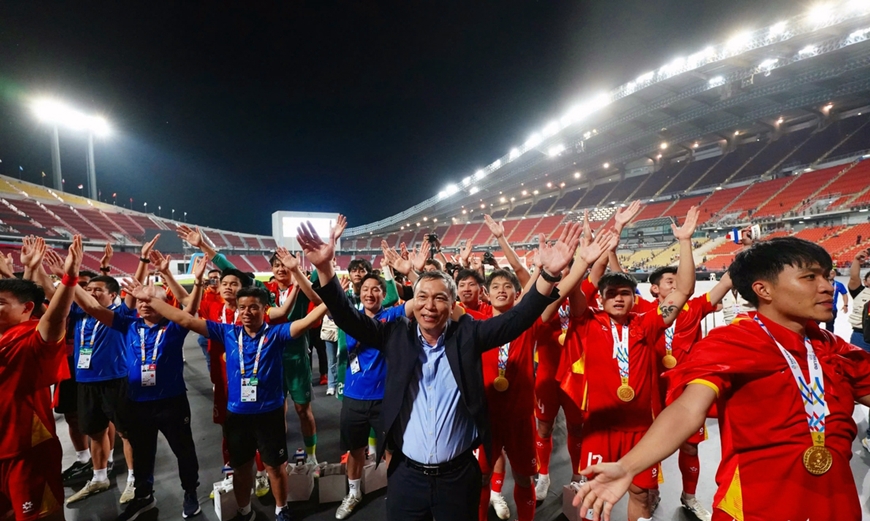 | Chủ tịch Liên đoàn Bóng đá Việt Nam Trần Quốc Tuấn mừng Huy chương Vàng SEA Games 33 với các cầu thủ U22 Việt Nam. Ảnh: tuoitre.vn |