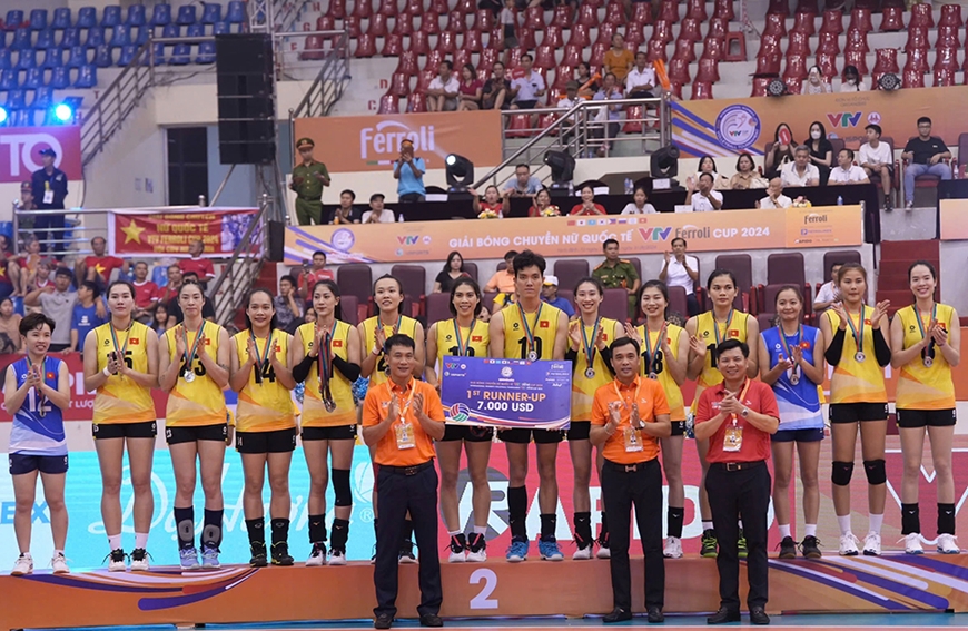 Đội tuyển bóng chuyền nữ Việt Nam nhận thưởng ngôi Á quân VTV Cup 2024. |
