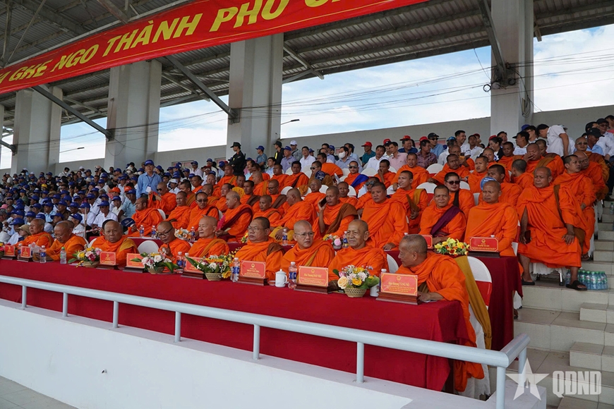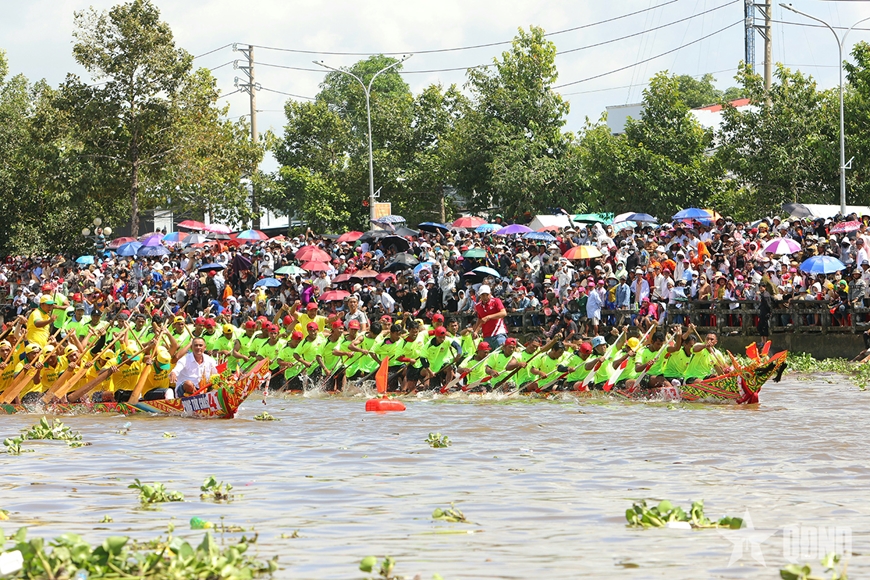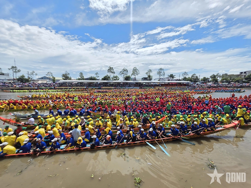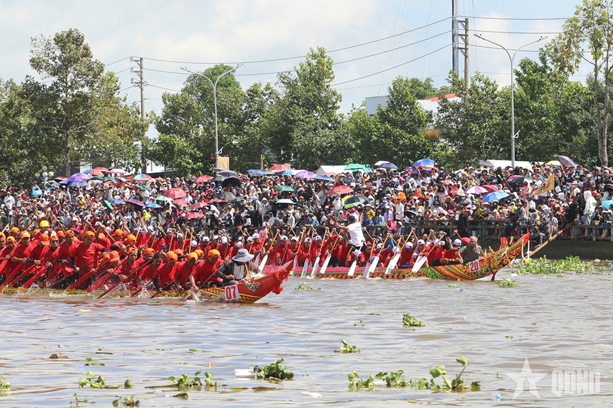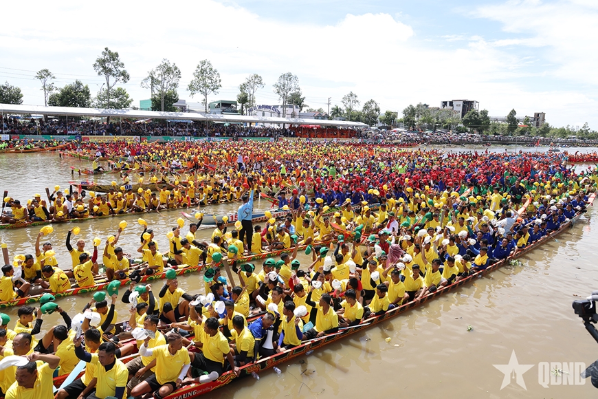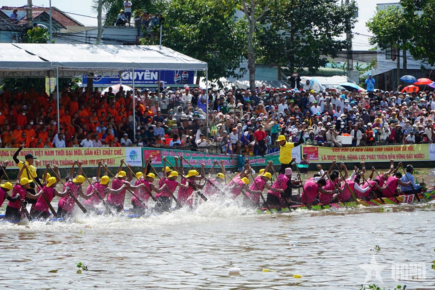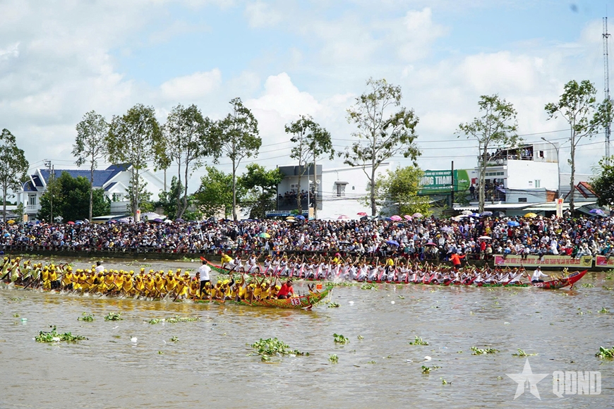 Ngay từ sáng sớm, hàng chục nghìn người dân, du khách và người hâm mộ đã có mặt hai bên bờ sông cổ vũ, tạo nên bầu không khí lễ hội sôi động, rực rỡ sắc màu truyền thống Khmer Nam Bộ.