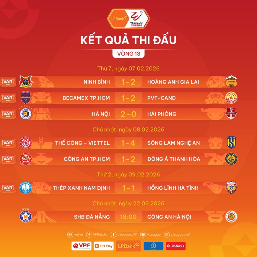 | Kết quả các trận đấu ở vòng 13 V-League 2025-2026. Ảnh: V.League fanpage |