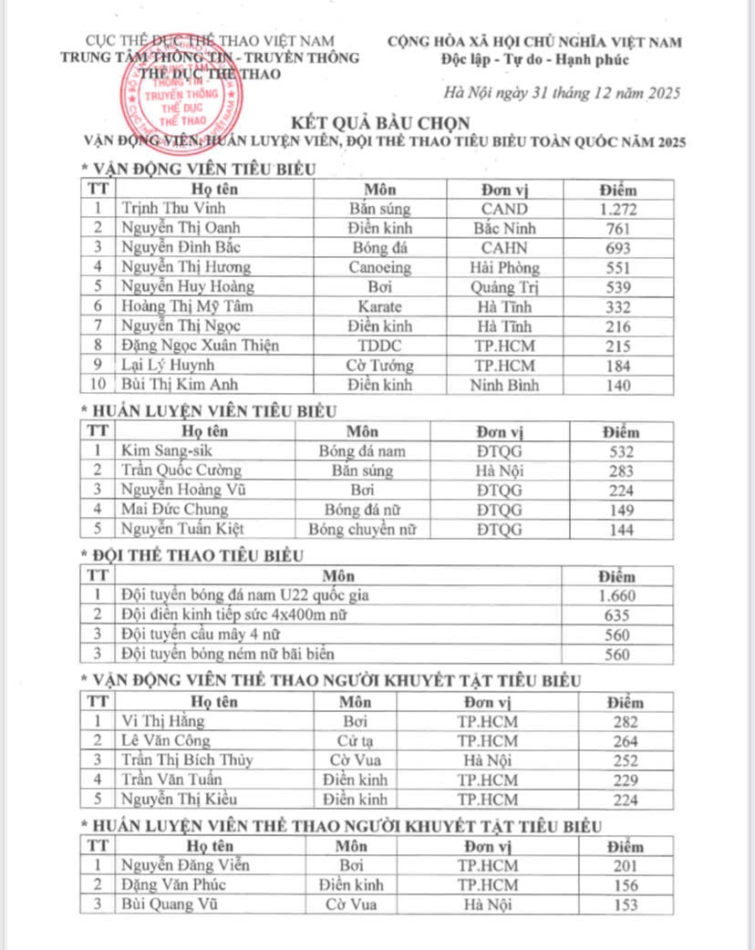 | Kết quả bầu chọn vận động viên, huấn luyện viên tiêu biểu toàn quốc năm 2025. Nguồn: Cục Thể dục thể thao Việt Nam |
