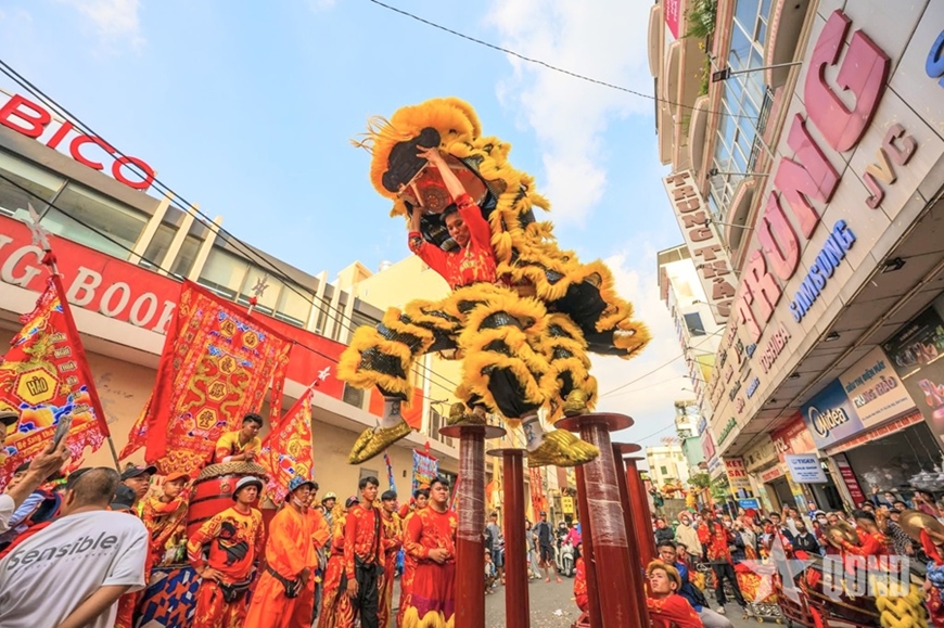 | Đội lân sư rồng trên đường phố TP Hồ Chí Minh những ngày đầu xuân. |
