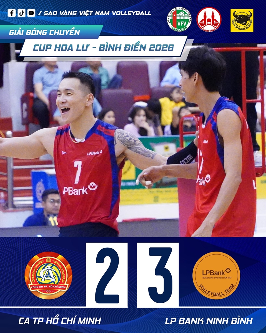 Tối 22-3, tại Nhà thi đấu Thể dục thể thao tỉnh Ninh Bình, câu lạc bộ LPBank Ninh Bình chạm trán câu lạc bộ Công an TP Hồ Chí Minh tại trận bán kết 2 nội dung nam Giải bóng chuyền Cúp Hoa Lư - Bình Điền 2026.