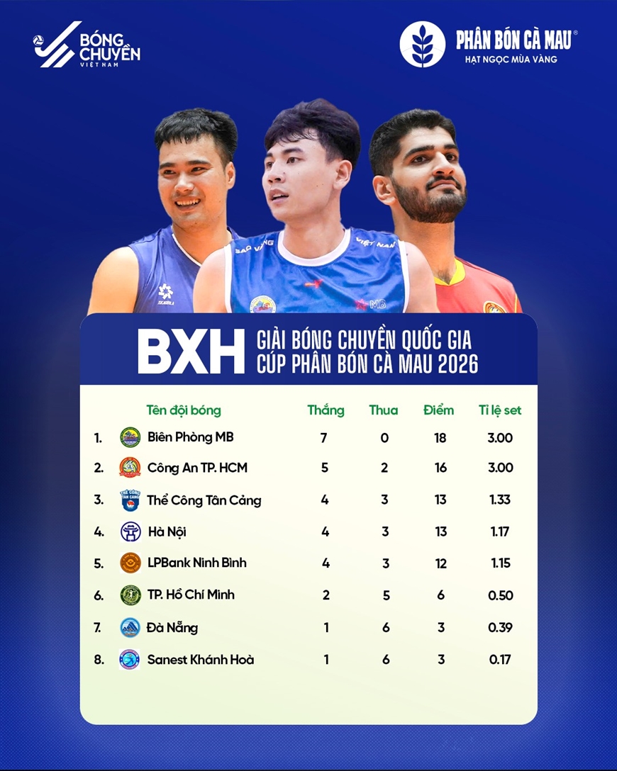 Đánh bại Thể Công - Tân Cảng 3-2, câu lạc bộ Biên phòng MB toàn thắng 6 trận tại vòng 1 Giải bóng chuyền vô địch quốc gia các câu lạc bộ năm 2026.