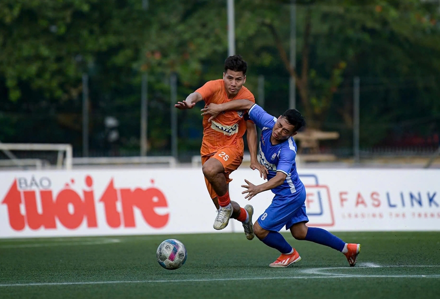 Đội bóng Công đoàn Ngân hàng Việt Nam (áo cam) áp đảo thế trận. Ảnh: KHƯƠNG XUÂN |