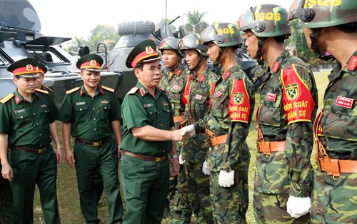 Thiếu tướng Hồ Thanh Tự, Phó bí thư Đảng ủy BTTM-Cơ quan BQP, Chủ nhiệm Chính trị BTTM kiểm tra Đại đội Kiểm soát quân sự, Lữ đoàn 144. Ảnh: MAI VÂN