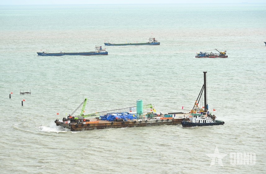 Trên đảo Hòn Khoai (xã Đất Mũi, tỉnh Cà Mau), gió biển thổi ràn rạt suốt ngày đêm. Dự án tuyến giao thông vượt biển ra đảo Hòn Khoai như một “đại công trường nổi” giữa trùng khơi. Khi mặt nước còn lăn tăn sóng nhỏ, từng tốp lính thợ, kỹ sư trong trang phục bảo hộ đã nhanh chóng vào vị trí. Tiếng động cơ, tiếng kim loại va chạm hòa lẫn tiếng sóng, tạo nên nhịp điệu lao động khẩn trương giữa biển trời mênh mông.