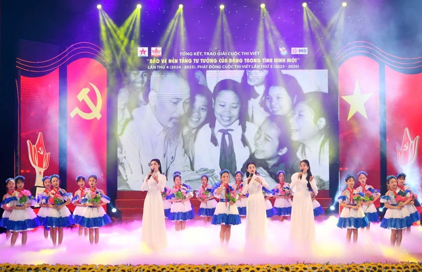 Chương trình nghệ thuật ca ngợi Đảng quang vinh, Bác Hồ vĩ đại tại Lễ tổng kết, trao giải Cuộc thi viết "Bảo vệ nền tảng tư tưởng của Đảng trong tình hình mới" lần thứ 4 do Báo Quân đội nhân dân tổ chức (tháng 5-2025). Ảnh: TUẤN HUY