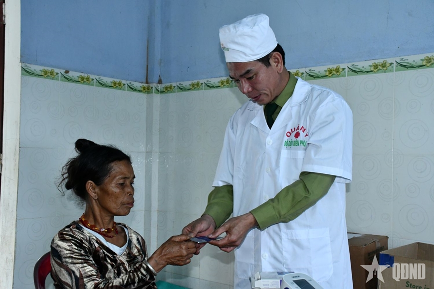 | Trung tá QNCN Trần Minh Vũ, Trạm trưởng Trạm quân dân y Pa Ling, Đồn Biên phòng A Vao, cấp thuốc miễn phí cho người dân Pa Cô. |
