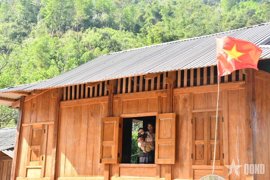 | Cờ Tổ quốc tung bay trước nhà sàn nơi núi rừng biên cương. |