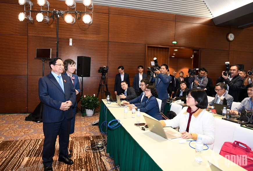 Thủ tướng Chính phủ Phạm Minh Chính thăm, động viên các nhà báo tác nghiệp tại Trung tâm Báo chí Đại hội XIV của Đảng. Ảnh: TRỌNG HẢI