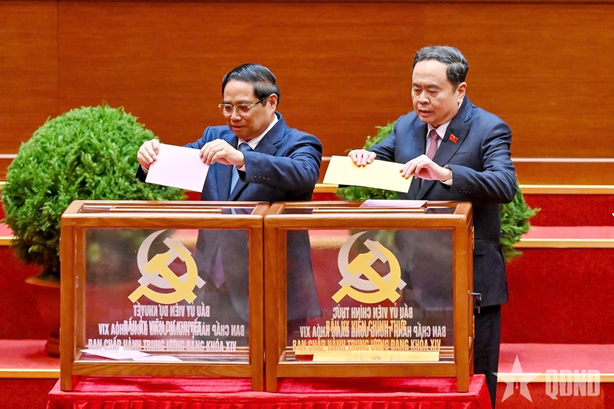 | Thủ tướng Chính phủ Phạm Minh Chính và Chủ tịch Quốc hội Trần Thanh Mẫn bỏ phiếu bầu Ủy viên Trung ương Đảng và Ủy viên dự khuyết Trung ương Đảng khóa XIV. Ảnh: TRỌNG HẢI |