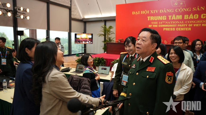 Đại tướng Nguyễn Trọng Nghĩa thăm, động viên phóng viên tại Trung tâm Báo chí Đại hội XIV.