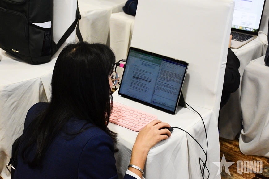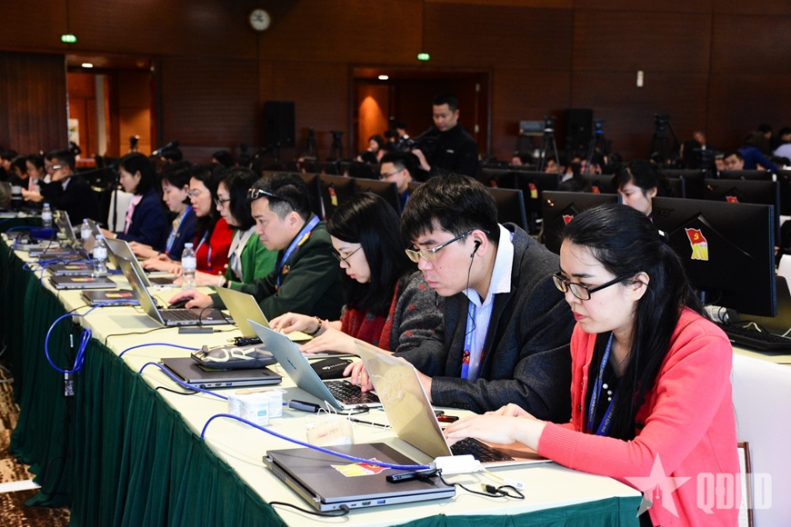 | Các phóng viên tác nghiệp tại Trung tâm Báo chí Đại hội XIV của Đảng. |