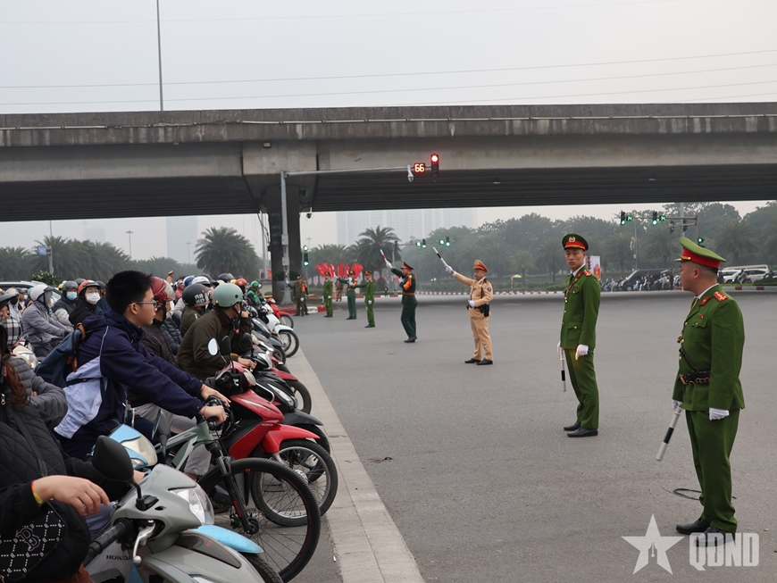| Lực lượng cảnh sát giao thông bảo đảm trật tự, an toàn giao thông trên các tuyến dẫn đoàn. |