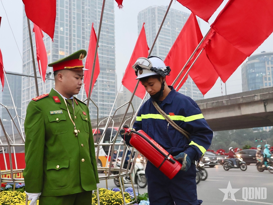 | Lực lượng Công an cơ sở và Cảnh sát PCCC&CHCN kiểm tra thiết bị bảo đảm an toàn PCCC tại các vị trí bảo vệ. |