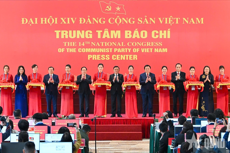 | Các đại biểu thực hiện nghi thức cắt băng khai trương Trung tâm Báo chí Đại hội XIV của Đảng. |