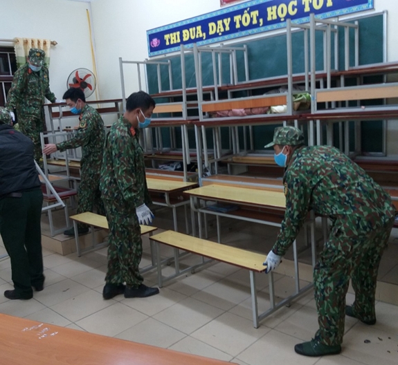 | Cán bộ, nhân viên Ban CHQS thị xã Đông Triều chuẩn bị cơ sở vật chất phục vụ công dân vào cách ly. |