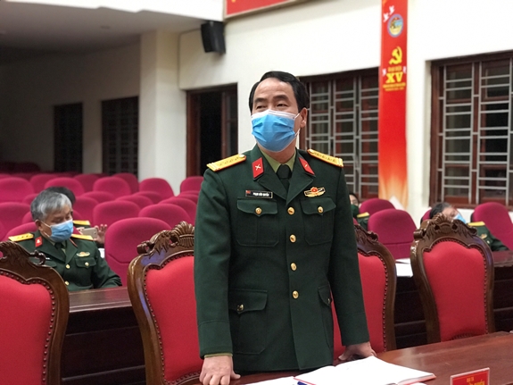 | Đại tá Phạm Hữu Quyền, Phó chỉ huy trưởng, Trưởng Ban chỉ đạo phòng, chống dịch Covid-19 Bộ CHQS tỉnh Hải Dương phát biểu tại hội nghị. |